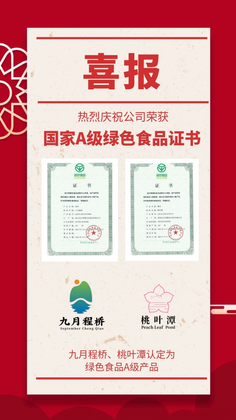 绿色引领健康,品质成就卓越。近日,经中国绿色食品发展中心审核,我司下属子公司——南京金庄智慧农业科技有限公司生产的粳米“桃叶潭”与籼米“九月程桥”,双双荣获“绿色食品A级产品”认证,并正式获得“绿色食品”标志使用授权。   A级绿色食品认证不仅要求产品符合严苛的产地环境标准,...  [详细]