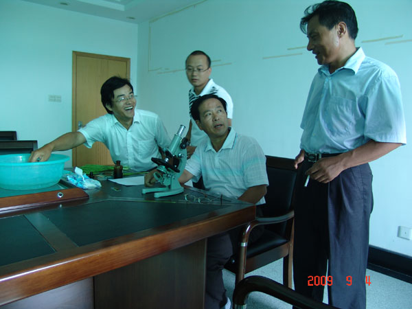 专家组成员王才林研究员(中)正在镜检,并与我公司研究所罗德祥所长(右一)交流。