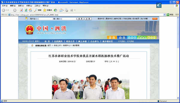2009年12月1日,由江苏农林职业技术学院和我公司共同承担的江苏省科技挂县强农富民工程子项目――泗洪县车门乡车门村水稻千亩机插秧示范基地建设项目顺利通过考察组验收。