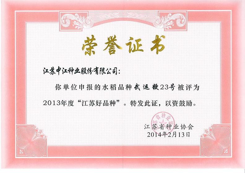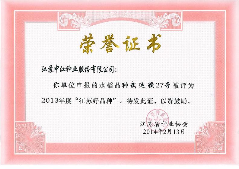 热烈庆祝我公司2013年申报的水稻品种武运粳23号和武运粳27号被江苏省种业协会评为“江苏好品种”!