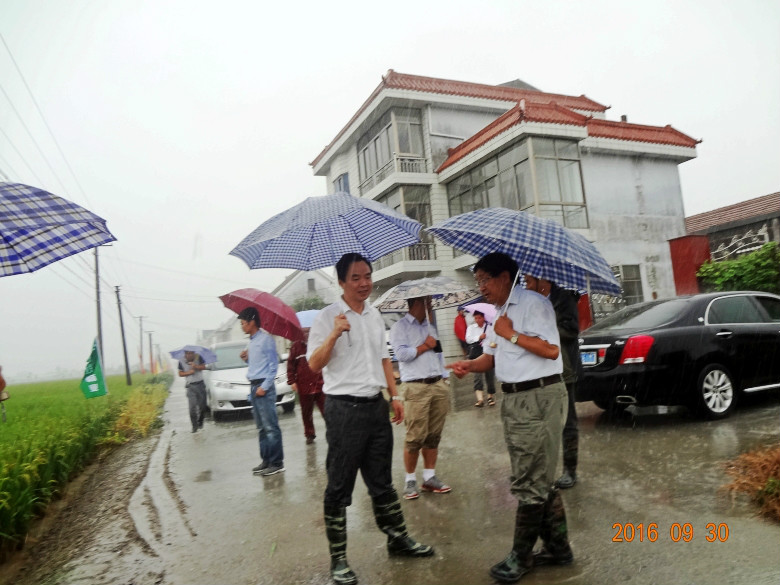 接着万院士一行冒着淅淅沥沥的秋雨,实地考察了如东县马塘镇亚苏村的宁粳8号百亩核心示范方。示范方面积106亩,采用机插精确定量栽培技术,5月28日播种,6月13日移栽,9月22日测产:亩有效穗数26.3万,每穗总粒数126.2粒,结实率92%,千粒重按26.5克计算,理论产量达809.19公斤/亩。万院士一行不顾雨水打湿衣服,深入田间地头,仔细查看了宁粳8号长势长相、穗粒结构,对该示范方的技术措施和品种表现给予了充分肯定。