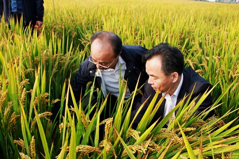 蒋总与南京农业大学副校长丁艳峰观察“宁粳8号”的后期生长情况