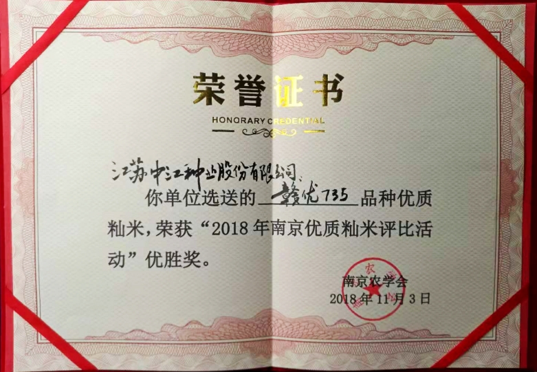 热烈祝贺我公司自主选育的赣优735品种,荣获“2018年南京优质籼米评比活动”优胜奖!
