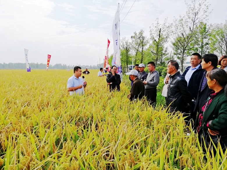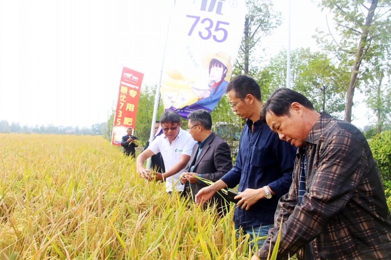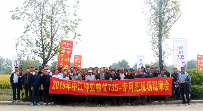 金秋十月,祖国华诞,峥嵘70载,与国同梦。2019年10月13日,来自江苏,安徽区域的县、乡镇经销商及种植大户150余人,来到沭阳县钱集镇观摩“赣优735+专用肥”示范田。一下大巴车,映入眼帘的是80余亩“赣优735+专用肥”示范田,一片黄灿灿的喜人景色。走到田间,大家纷纷夸奖品种表现不错,个子矮,穗子大,粒子多,结实率高。大家对“赣优735+专用肥”种植的田间表现非常满意,良种良法,科学管理,纷纷表示明年一定要推广。“灾年不减产,丰年更高产”,这是已推广该品种的经销商们最好的评价。