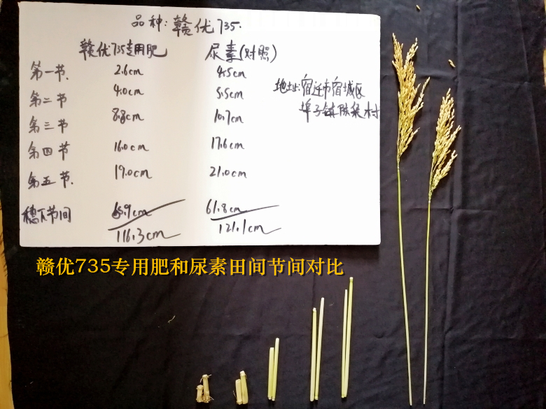 普瑞丰艾方部长在田间讲解专用肥的成分及用法用量。艾部长表示,专用肥是根据赣优735的特征特性和高产所需的条件量身定制的肥料,田间施用专用肥对水稻有五个方面的好处:一是大田移栽后返青快,缩短缓苗期,防治僵苗,提高抗逆能力;二是促进低位分蘖,矮壮多蘖,搭好丰产架;三是促进迅速扎根,根系发达,提高肥料利用率;四是缩短基部节间,增加管壁厚度,增强抗倒伏能力;五是延缓功能叶片的衰老,促进灌浆提高结实率,千粒重,改善米质,增加产量,提高亩效益。施用时间:直播田在25-30天(3叶期)施用20斤/亩;移栽田及机插田在移栽后5-10天施用20斤/亩。一包肥料是20斤(代替20斤尿素),施用时根据田间肥力水平而定,底肥不足的田块增加10斤尿素。