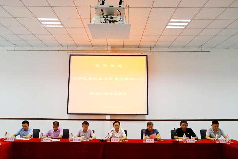 7月27日下午,江苏红旗种业股份有限公司总经理査联群率高管团队及分子公司负责人一行,到公司交流座谈。公司管理层以及各部门负责人参加会议。