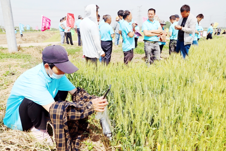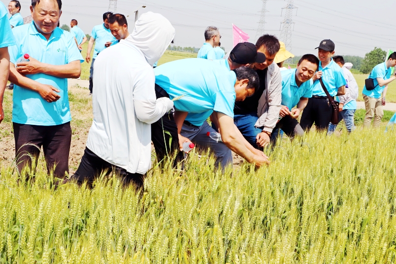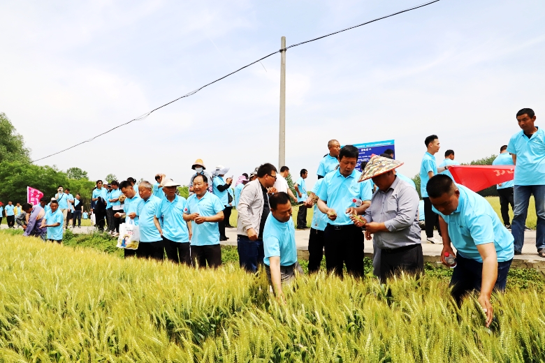 上午,参会代表先后观摩了位于程桥街道金庄基地、大李村的“扬辐麦15”、“宁麦资958”千亩示范方,示范方内,田间长势旺盛,穗大粒重,颗粒饱满,得到了与会人员的一致好评。田间观摩结束后,各县市经销商、种植大户代表纷纷在田间留下了珍贵的合影。