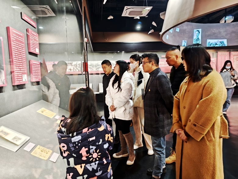 随后,来到毗邻“竹镇市抗日民主政府”旧址的“六合抗日斗争展览馆”,通过图文展示、实物展品、雕塑装置、多媒体影像、数字艺术场景还原等形式,展现了六合从日军侵华到新时代发展的历史图景。党员们在这里边走边看、边听边议,缅怀革命仁人志士,感慨幸福生活的来之不易。