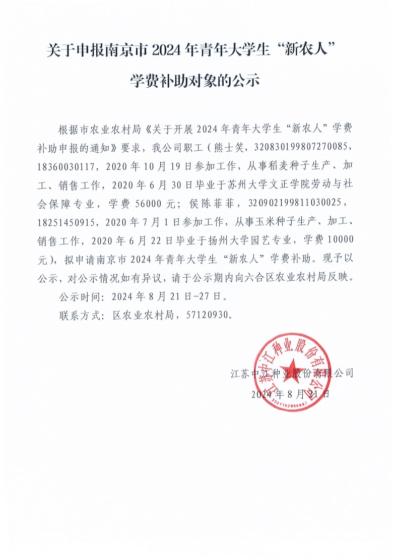 关于申报南京市2024年青年大学生“新农人”学费补助对象的公示