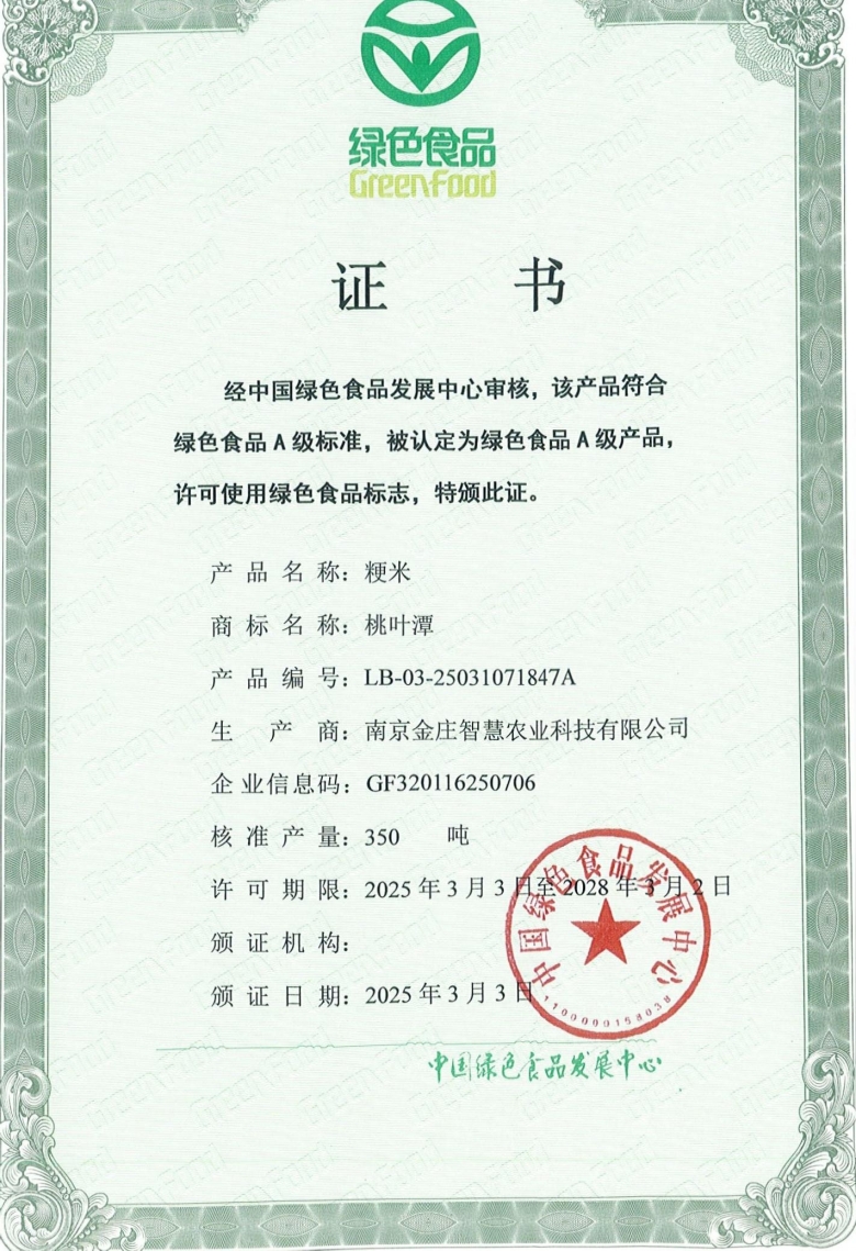 绿色引领健康,品质成就卓越。近日,经中国绿色食品发展中心审核,我司下属子公司——南京金庄智慧农业科技有限公司生产的粳米“桃叶潭”与籼米“九月程桥”,双双荣获“绿色食品A级产品”认证,并正式获得“绿色食品”标志使用授权。